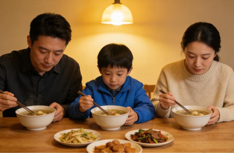 那顿饭,我们三个人吃得很安静。建国一直在给我和儿子夹菜,自己却没吃几口。